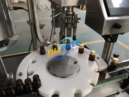 Automatic cap placing and crimping machine on the same platform. platform and the surrounding use stainless steel materials, beautiful appearance, durable, conforming to GMP standards.